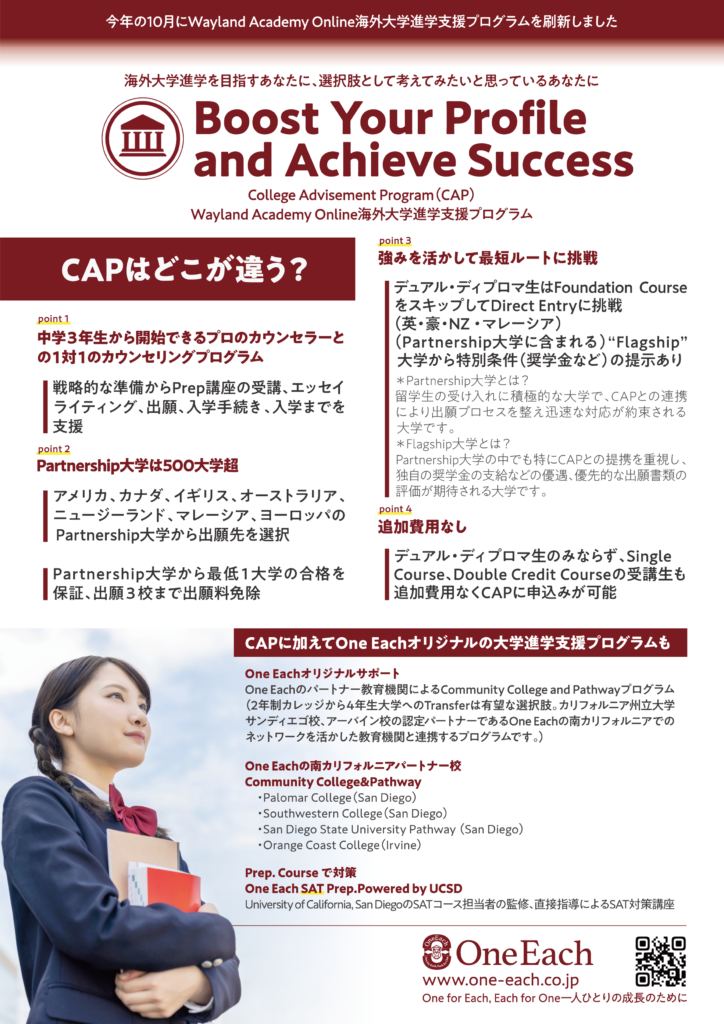 刷新した海外大学進学支援プログラムとOne Each ならではのCommunity College & Pathway プログラムの概要をこちらでご案内しております。